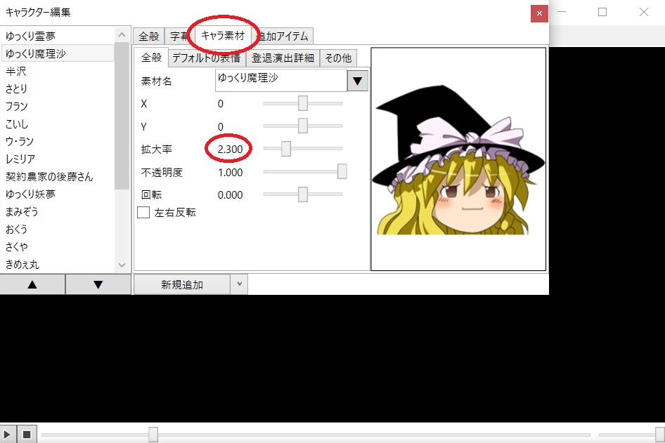 動画の画質設定によってキャラの大きさは変わってくる、フルHDならキャラを大きくする必要がある